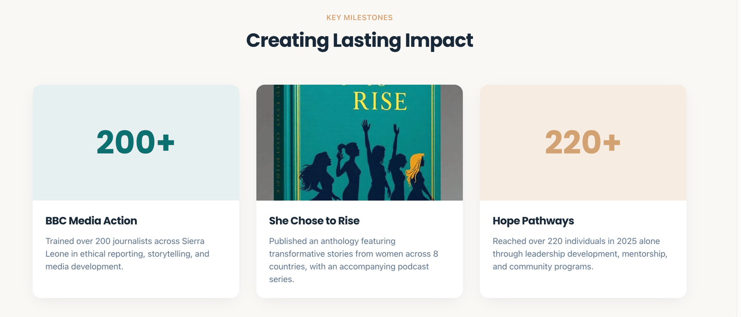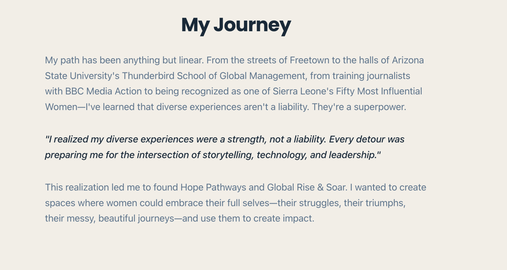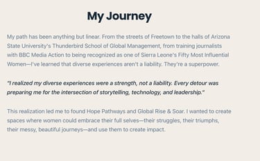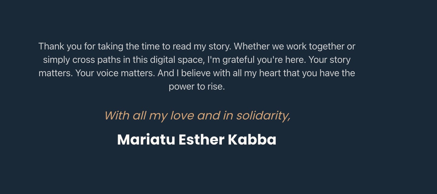 I'm Mariatu. A media development specialist, social entrepreneur, and advocate dedicated to helping individuals and businesses create transformative impact through education, storytelling, and leadership.